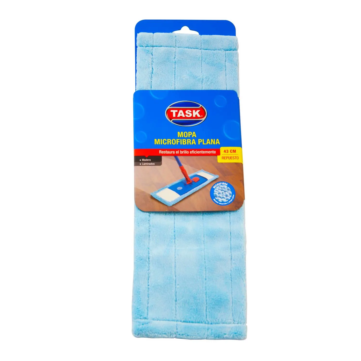 MOPA MICROFIBRA PLANA de Task: Es de tamaño ideal para superficies pequeñas. La microfibra atrapa tanto polvo como líquidos en una sola pasada. Su uso en seco retiene la suciedad mediante carga estática impidiendo que el polvo se levante o disperse. Se lava y seca fácil, ofrece limpieza óptima y rápida.