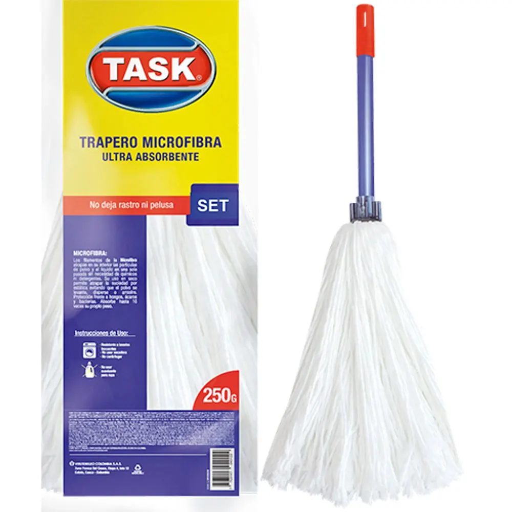 Trapero TASK MICROFIBRA: Trapero de microfibra con cabo ultra absorbente, ideal para limpiar con menor consumo de agua y químicos. Captura hasta 10 veces su propio peso en agua y no retiene malos olores, garantizando ambientes frescos. Solución práctica, duradera y eficiente para el hogar.